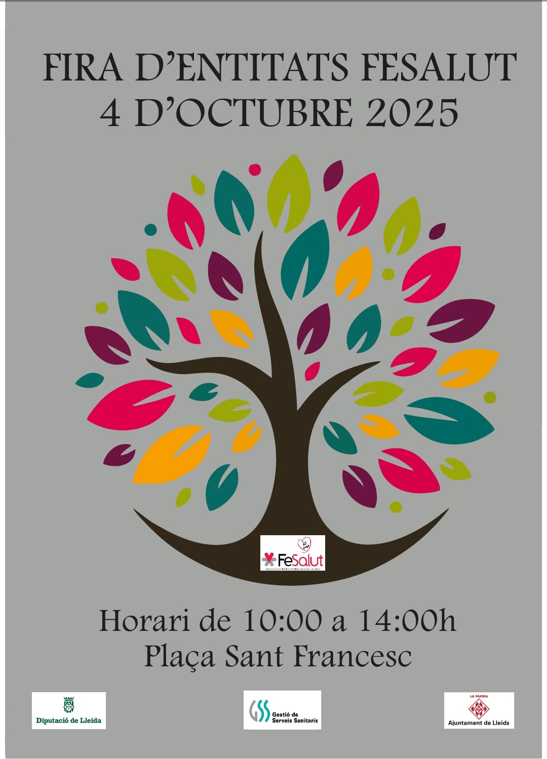 El proper 4 d'octubre de 10:00 a 14:00h. a la plaça Sant Francesc de Lleida ens trobarás a la Fira d'Entitats que organitza FeSalut. Compartirem jornada amb diferents entitats de salut. T'esperem per escoltar qualsevol preguntar, dubte etc.